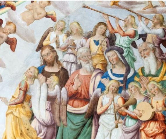 Nel tamburo cinque figure di Santi: Leonardo, Agostino, Bernardino da Siena, antonio Abate, Sebastiano tutti con il simbolo del loro martirio. Sul lato sinistro del nicchione San Biagio. In alto lo stemma della famiglia Colangeli. Sul pilastro destro la Vergine Lauretana e altre figure di Santi come un San Sebastiano sempre dello Spagna. Nel terzo nicchione troviamo: nel catino l’Eterno Benedicente tra due angeli adoranti; nel tamburo la Madonna seduta in trono col Bambino, a sinistra San Macario, segue San Giacomo. A destra San Filippo e un altro Santo. Sotto la figura della Madonna si legge la data A. SALUTIS M.D.V. MENS. OCTOBTIS. Queste figure, di stile Abruzzese, assai diverse dai precedenti, sono più vicine alla mano di Nicolo’ Filotesio, mentre, altri critici, attribuiscono all’eugubino “Petto” attivo dal 1460. Nel quarto nicchione i dipinti sono di Giovanni di Pietro detto Lo Spagna e del suo allievo Giovanni di Girolamo. La parte più interessante sono i dipinti che occupano tutta l’abside con Vergine e Bambino, Angeli, Santi, con le storie di San Michele Arcangelo sul Gargano 1518. Nel finto pilastro di destra si legge: IOHANNE HYSPANO PENTORE MDXVIII. Insomma una chiesa di un piccolo paese però preziosissima di opere d’arte commissionate ad un artista in voga all’epoca come lo Spagna. In particolare l’affresco che rievoca la leggenda del Gargano e’ di grande importanza sopratutto perche’ attesta, e da vanto, alle origini longobarde del territorio.