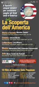 Dopo un primo incontro dedicato alla Storia ed alla Società Americana proveremo a conoscere meglio gli USA, in considerazione di antichi e consolidati rapporti di Spoleto con molti artisti americani, attraverso il cinema, la letteratura, la musica e le arti visive. Ogni fine settimana (26 settembre, 3, 17, 24 e 31 ottobre) avremo una conferenza il sabato alle ore 17.30 e la proiezione di un film al Cinema Sala Pegasus (il sabato alle 15.00 e la domenica alle 11.00 od alle ore 15.00).