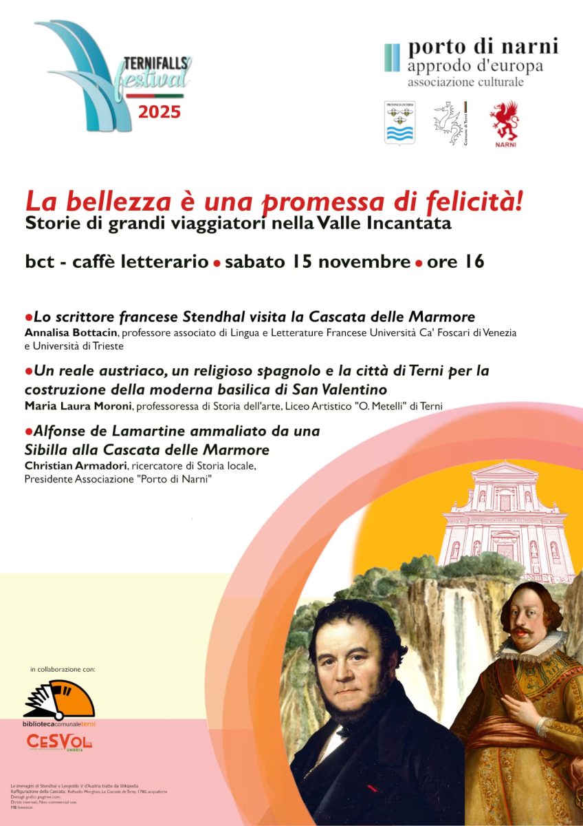 Al Caffè letterario della biblioteca comunale, sabato 15 novembre ore 16:00, nella conferenza dal titolo La bellezza è una promessa di felicità si alterneranno gli interventi di: Annalisa Bottacin, professore associato di Lingua e Letteratura Francese, Università Ca’ Foscari di Venezia e Università di Trieste, esperta di Stendhal (Lo scrittore francese Stendhal visita la Cascata delle Marmore); Christian Armadori, studioso di storia locale, presidente dell’associazione Porto di Narni (Alphonse de Lamartine ammaliato da una Sibilla alla Cascata delle Marmore); Maria Laura Moroni, storica dell’arte, docente al liceo artistico Metelli (Un reale austriaco, un religioso spagnolo e la città di Terni per la costruzione della moderna basilica di San Valentino).