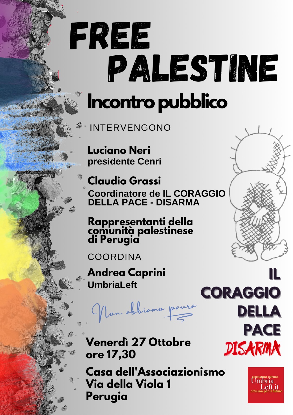 PERUGIA – Organizzato dalle associazioni Il coraggio della pace – Disarma e UmbriaLeft, venerdì 27 ottobre alle 17.30 si terrà