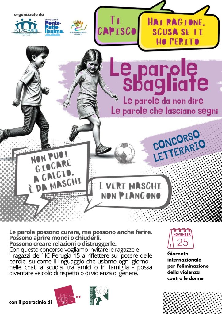 PERUGIA – In occasione del 25 novembre, Giornata internazionale per l’eliminazione della violenza contro le donne, le Associazioni Futuro Ponte APS e Pontepattolissima, promotrici dell’iniziativa insieme all’IC Perugia 15 e con il patrocinio delle associazioni Liberamente Donne e Sovrapensiero, lanciano il concorso letterario “Le parole sbagliate. Le parole da non dire. Le parole che lasciano segni”, rivolto agli studenti e alle studentesse della scuola secondaria di primo grado dell’Istituto IC Perugia 15.