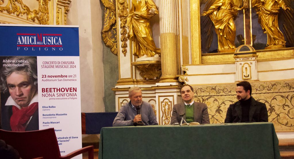 Come spesso capita in conferenza con gli Amici della Musica, si affacciano anche le note, quelle di Marco Scolastra che ha scandito al pianoforte le parole di Michelangelo Mattoli, anche lui folignate trasferitosi da undici anni a Pesaro. “La Nona sinfonia è l’opera più rivoluzionaria mai scritta da un compositore. E non solo per l’introduzione del coro mai avvenuta prima. A renderla unica è il suo essere un viaggio spirituale meraviglioso nella vita di ognuno, nel destino del genere umano fatto di sofferenza che trova riscatto nella fratellanza. Beethoven ci dice che non siamo soli come ben sottolinea l’ode di Schiller del celebre Inno alla Gioia”.