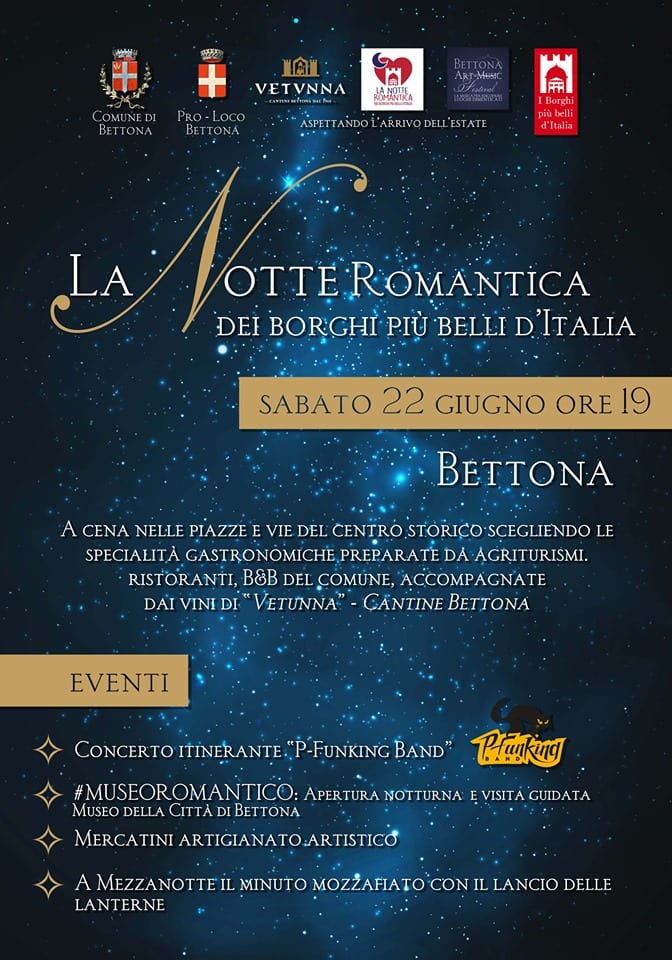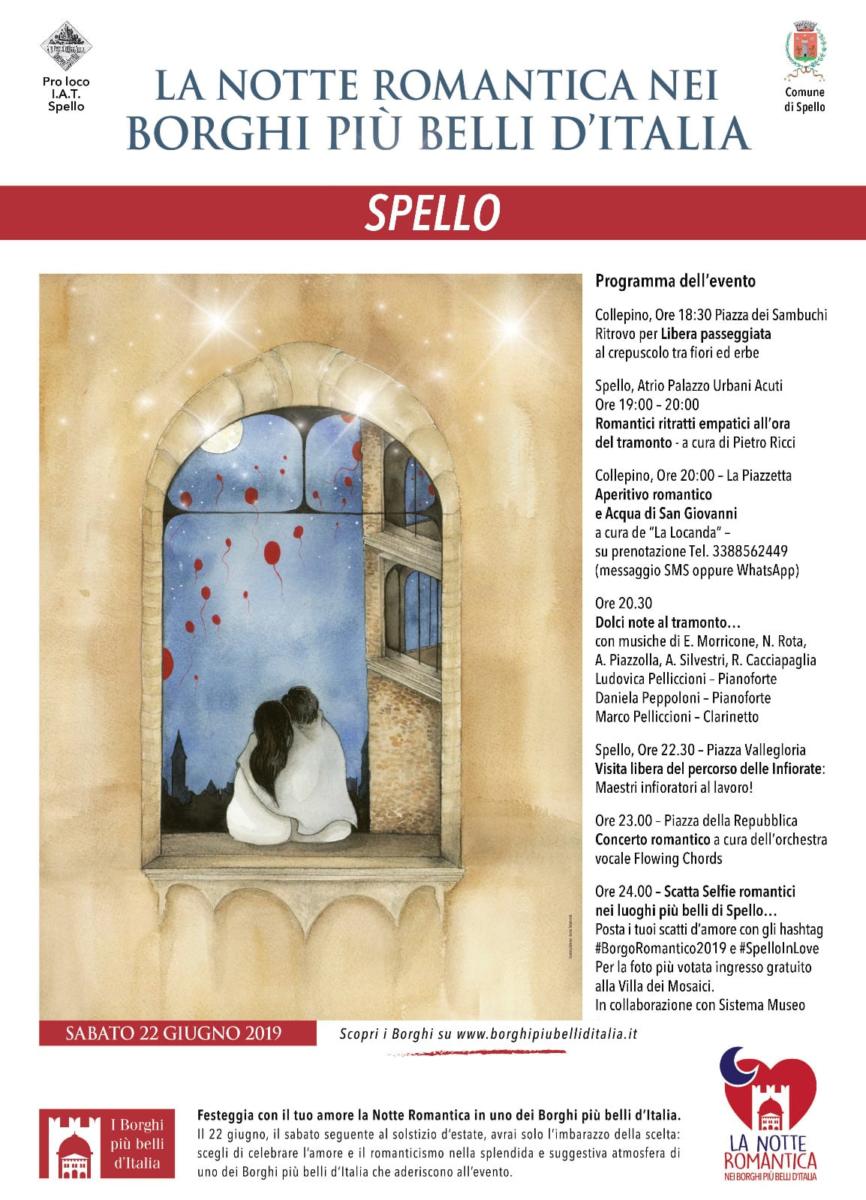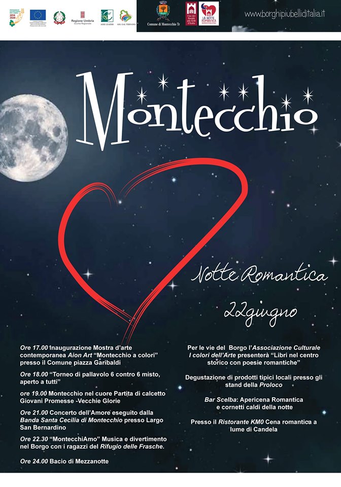 “La Notte Romantica” quest’anno si celebra in 200 tra i Borghi più Belli d’Italia. Sono stati tanti, infatti, i Comuni italiani che hanno aderito all’evento, organizzato dal Club ed in programma sabato 22 giugno, nel fine settimana successivo al solstizio d’estate. Di questi ben 14 sono umbri: Allerona, Arrone, Bettona, Bevagna, Castiglione del Lago, Deruta, Lugnano in Teverina, Montecchio, Montone, Paciano, Panicale, Spello, Trevi, Vallo di Nera.
