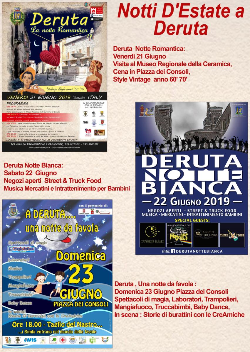 In molti Comuni, infine, sono in programma anche degli eventi per domenica 23 giugno. L’amministrazione comunale di Deruta, ad esempio, ha organizzato “A Deruta… una notte da favola”, per festeggiare un momento di serenità e unità rivolto a tutti i bambini e alle loro famiglie. A partire dalle ore 18, l’intera piazza dei Consoli si è trasformata in una città a misura di bimbo. Trampolieri, mangiafuoco, spettacoli di magia, laboratori, musica, baby dance, truccabimbi e storie di burattini animeranno il centro storico di Deruta a luci soffuse.
